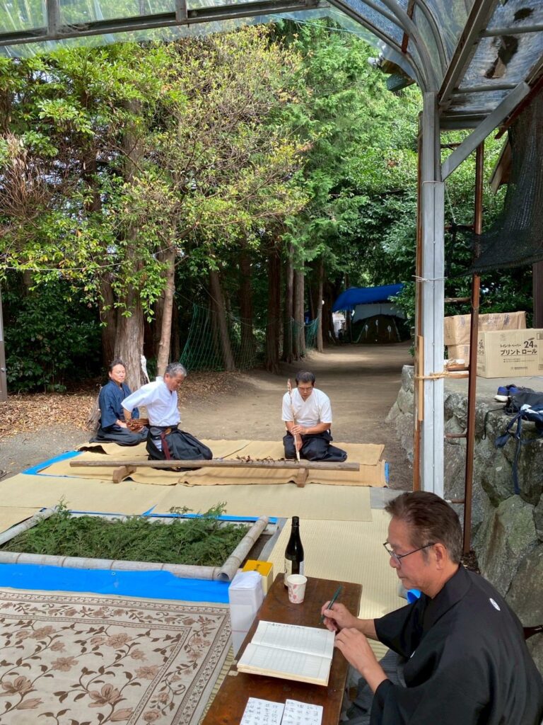 今回はなかなか当たらなくて、何度も射ち直して、ようやくこの矢場の井川先生が的中して、金的神事が無事に終わりました。